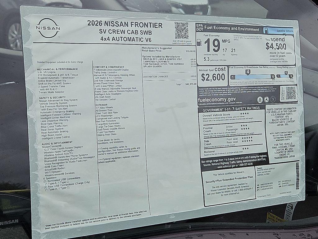 Discover rugged capability and modern comfort with this 2026 Nissan Frontier SV 4WD, now available in Norfolk, VA. Powered by a robust V6 3.8L gasoline engine, this Nissan Frontier delivers confident towing and strong on- and off-road performance while maintaining a refined ride for daily driving. Equipped with Android Auto and Apple CarPlay, you’ll enjoy seamless smartphone integration for navigation, music, and hands-free calling. Safety features include a Back-Up Camera, Rear Parking Sensors, and Lane Departure Warning to enhance awareness and protect passengers on every trip. This Nissan Frontier SV combines practical utility with thoughtful tech: a spacious crew cab, durable bed for gear and tools, and convenient features designed for active lifestyles. The 4WD system offers traction in wet, snowy, or rugged conditions, making it an excellent choice for coastal and inland drives around Norfolk and beyond. We’re offering the best price on this 2026 Nissan Frontier SV in the area — exceptional value for a well-equipped, late-model truck. Whether you need a dependable workhorse or a weekend adventure vehicle, this Nissan Frontier is ready. Contact us to schedule a test drive in Norfolk, VA, and experience the performance, safety, and connectivity that set this Nissan Frontier apart.