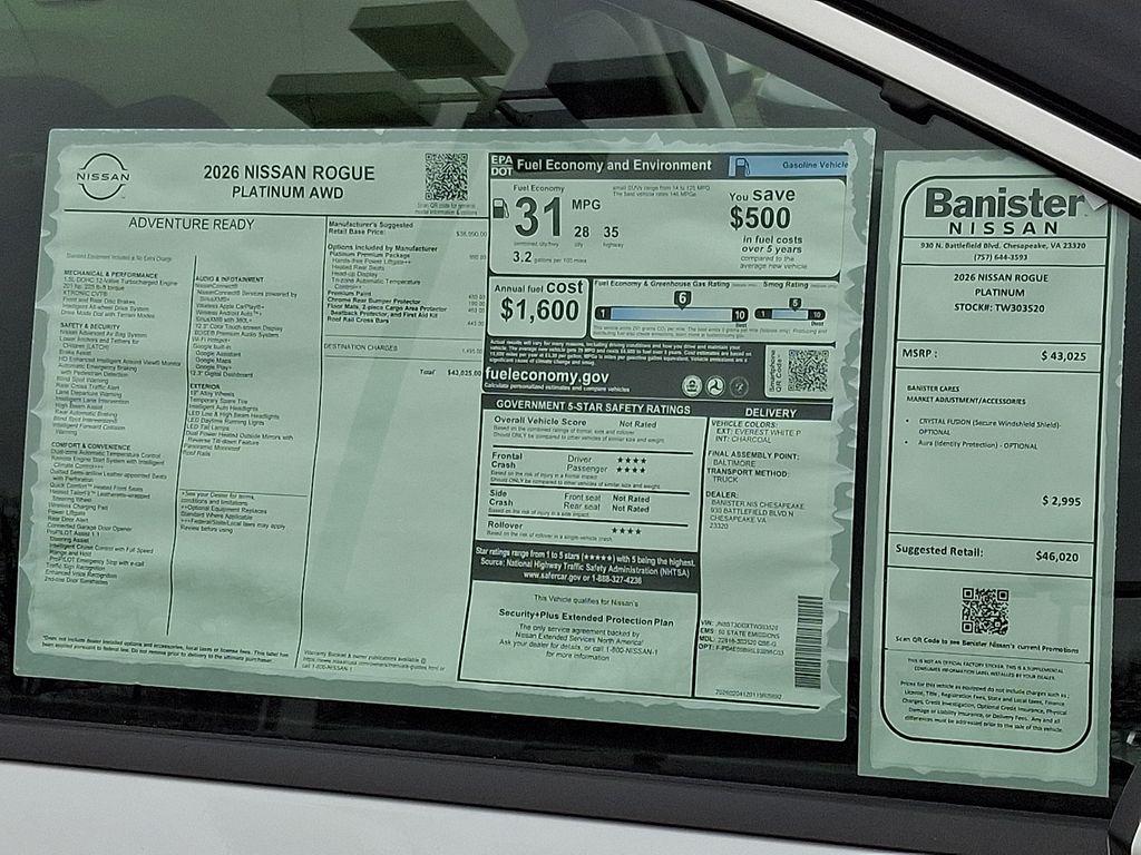 Experience the perfect blend of style, efficiency, and advanced technology with this 2026 Nissan Rogue Platinum AWD, now available in Chesapeake, VA. This Platinum trim stands out with a fuel-savvy 3-cylinder, 1.5L gasoline engine paired with all-wheel drive for confident handling in any season. With premium features like a heated steering wheel and a back-up camera, every drive becomes more comfortable and secure. Inside, enjoy the immersive BOSE stereo system that delivers crisp, powerful sound for every road trip. Seamless smartphone integration comes standard with Apple CarPlay and hands-free Bluetooth, keeping navigation, music, and calls conveniently accessible while you stay focused on the road. The Nissan Rogue's upscale interior materials and thoughtful tech make every commute feel first-class. This Nissan Rogue Platinum is competitively priced and offers the best price in the Chesapeake area—exceptional value for a top-tier compact SUV with AWD capability. Whether you're navigating city streets or exploring nearby coastal roads, this Nissan Rogue provides a refined riding experience without sacrificing fuel efficiency. Don't miss the chance to own a high-spec 2026 Nissan Rogue Platinum that combines safety, comfort, and connectivity in a stylish package. Located in Chesapeake, VA and priced to sell, this vehicle won't last long. Contact us today to schedule a test drive and lock in the best price on this outstanding Nissan Rogue Platinum AWD.