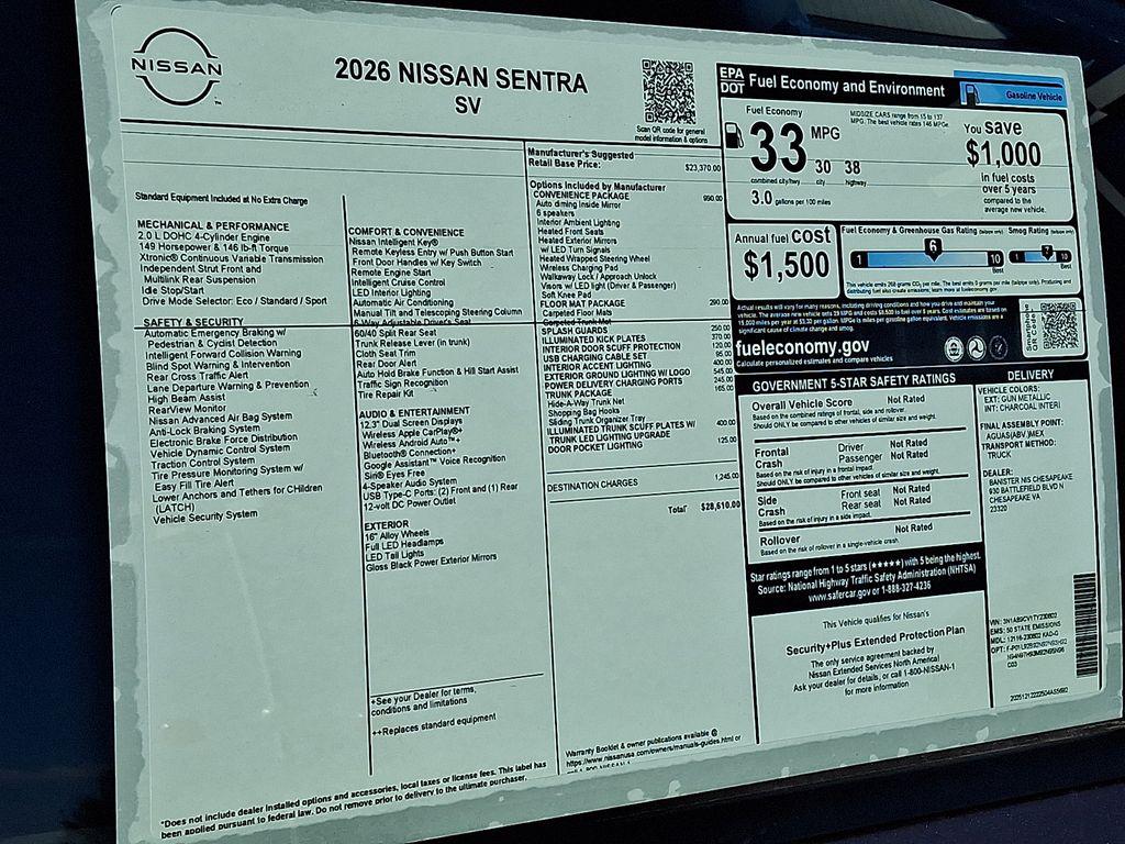 2026 Nissan Sentra SV — Exceptional Value in Chesapeake, VA Looking for a reliable, feature-packed compact sedan at the best price in Chesapeake, VA? This 2026 Nissan Sentra SV delivers efficiency, comfort, and smart safety technology, making it an ideal choice for daily commuting and weekend drives. Powered by a responsive engine, the Nissan Sentra SV balances fuel economy with confident acceleration for city and highway travel. Key features include Back-Up Camera for easier parking, Automatic Climate Control to keep the cabin comfortable, and Remote Start for convenience during hot or cold weather. Advanced safety systems include Forward Collision Warning to help reduce the risk of accidents, while Android Auto integration keeps your smartphone apps, navigation, and music seamlessly accessible on the road. Inside, the Nissan Sentra SV offers a refined cabin with supportive seating and thoughtful storage solutions. The sedan's exterior styling is modern and aerodynamic, turning heads without sacrificing practicality. With its competitive pricing and excellent fuel efficiency, this vehicle represents the best price in the area for drivers seeking value and reliability. Located in Chesapeake, VA, this 2026 Nissan Sentra SV is ready for a test drive. Contact us today to schedule a viewing, take advantage of favorable financing options, and secure a dependable sedan that checks all the boxes for comfort, safety, and technology.